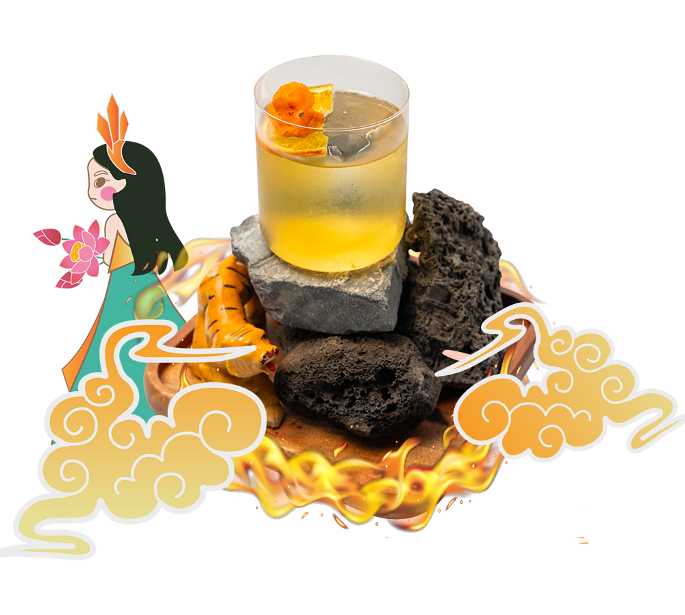 An earth-shattering battle where the Purple Rice Wine of the Land confronts the smoky Laphroaig of the Sea. The conflict erupts with the fiery heat of ginger, creating a symphony of flavors—complex, powerful, and dramatic.